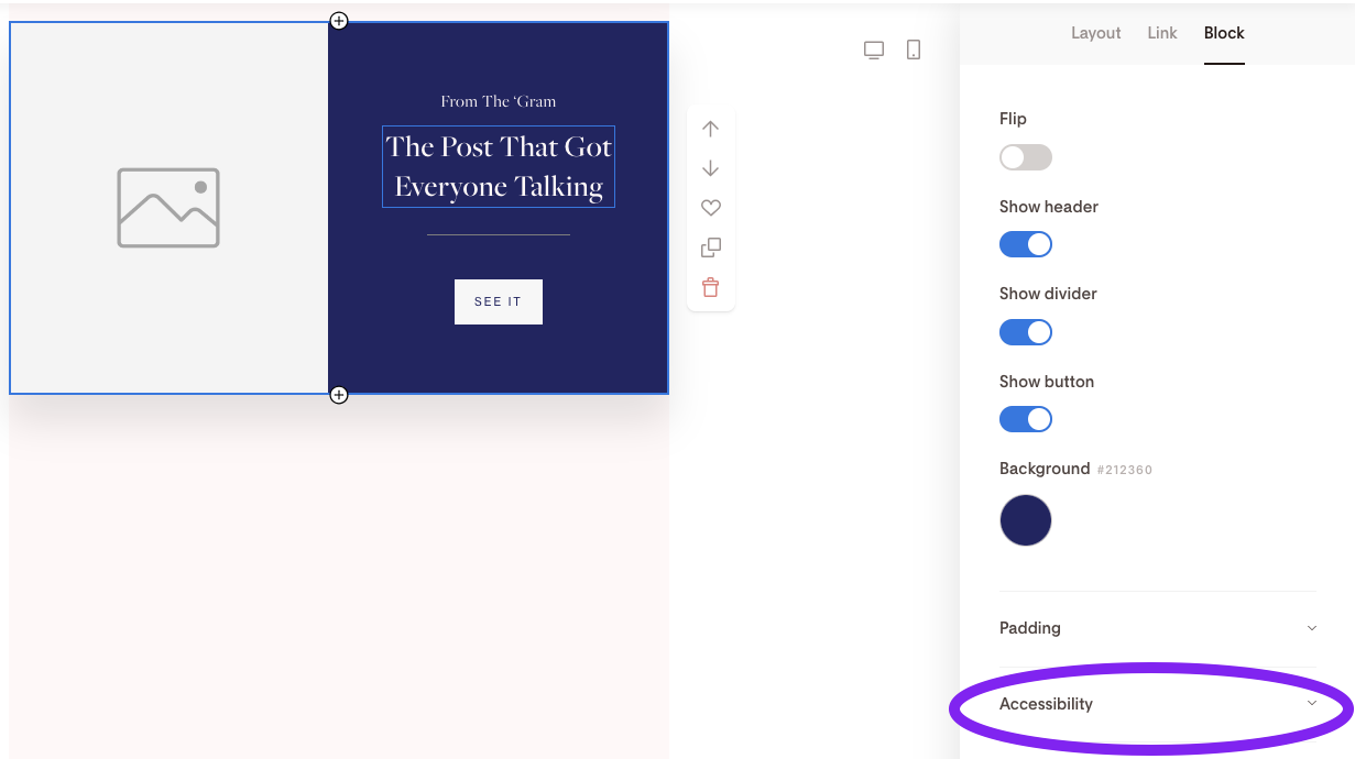 Once you’ve added an image block to your email, you will see “Accessibility” in the right column on the bottom as shown in the image below.